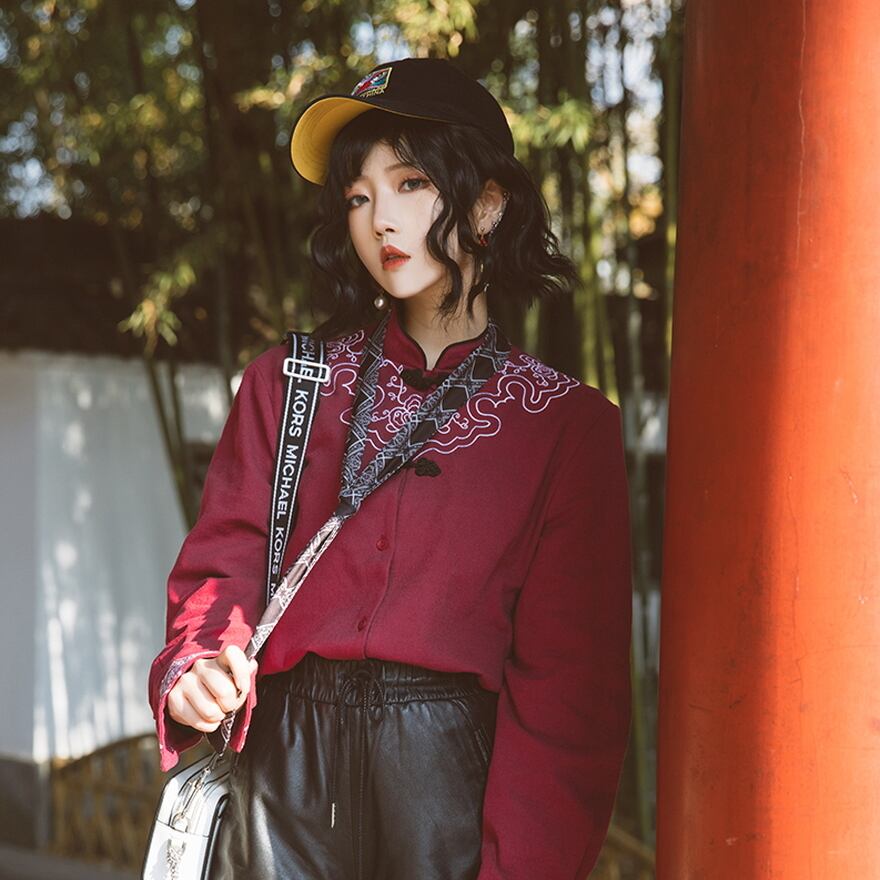 中国伝統のマオカラーにチャイナボタン、民族調の刺繍柄が個性的な長袖シャツです。