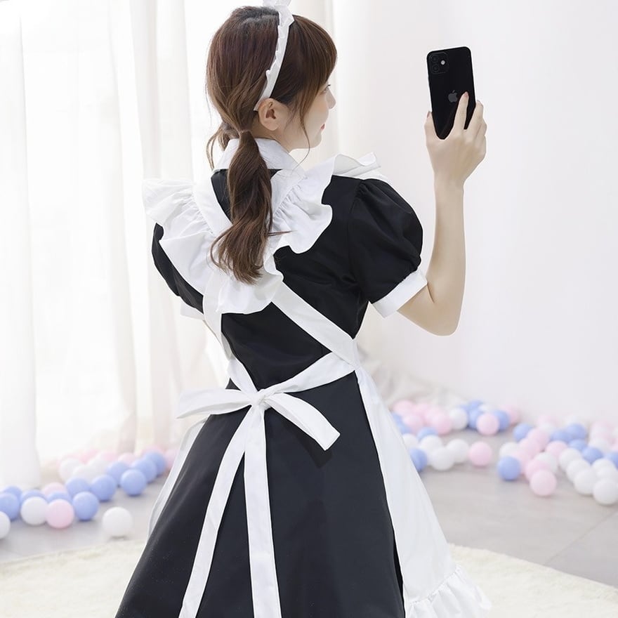 大きめなエプロンに半袖ワンピ、ヘアドレスのオールインワン