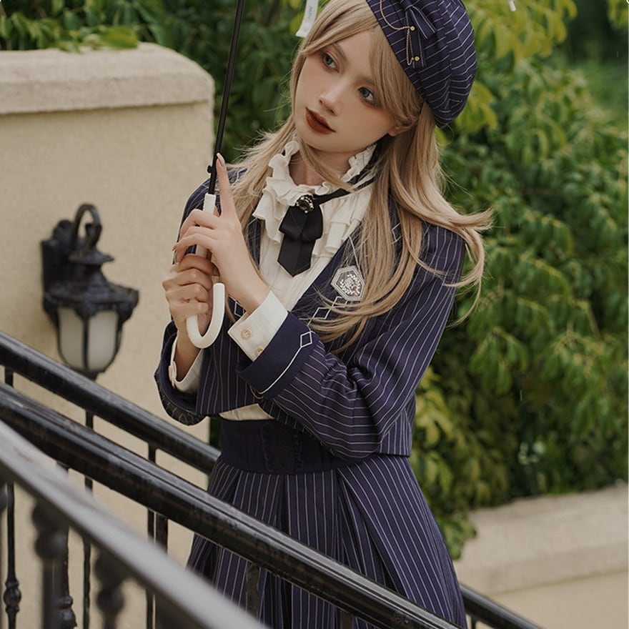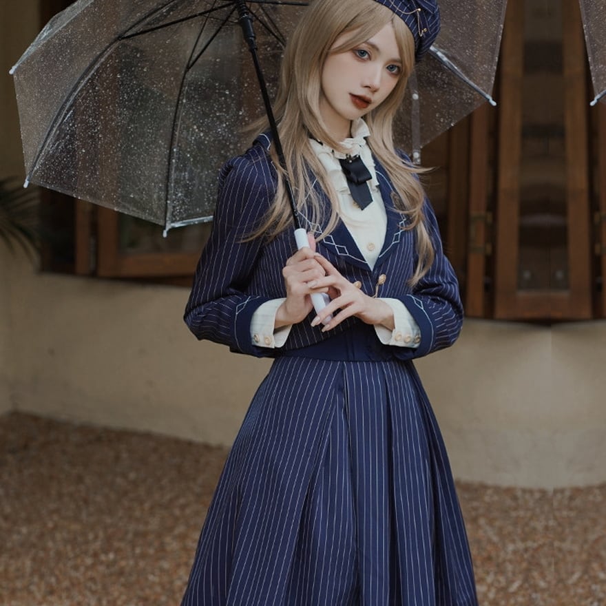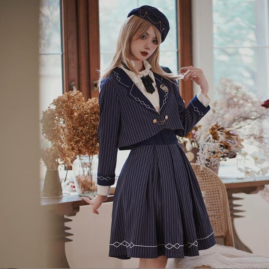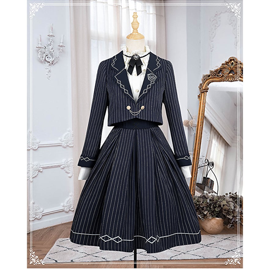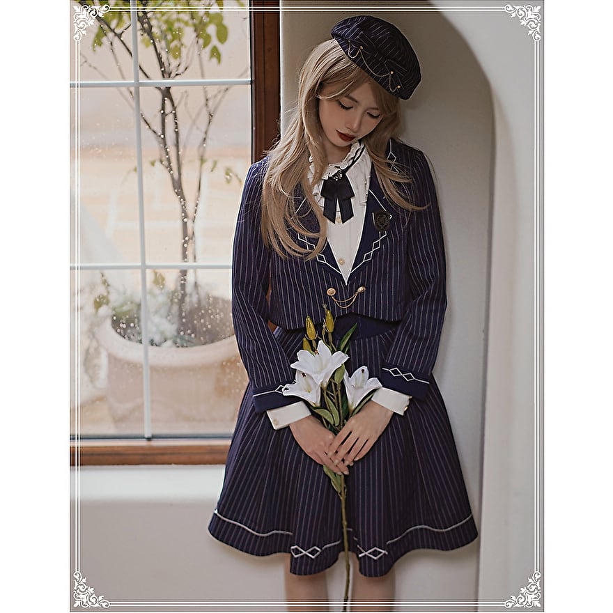 SEASONZ ロリータ クラロリ オールインワン ピンストライプ ジャケット リボン付きシャツ スカート 帽子 バッジ ロリータ 学園風 ゆめかわ