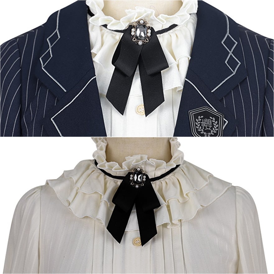 ジャケットにリボン付きの白シャツ、スカート、帽子が付属します。