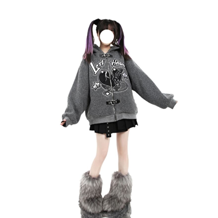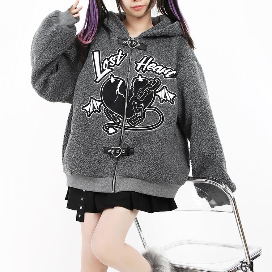SEASONZ Catwish ロリータ フーディ 厚手 もこもこ ボア LOST HEART 英字ロゴ ZIPアップ Love バックルベルト JK ストリート系 地雷系女子 ゆめかわ