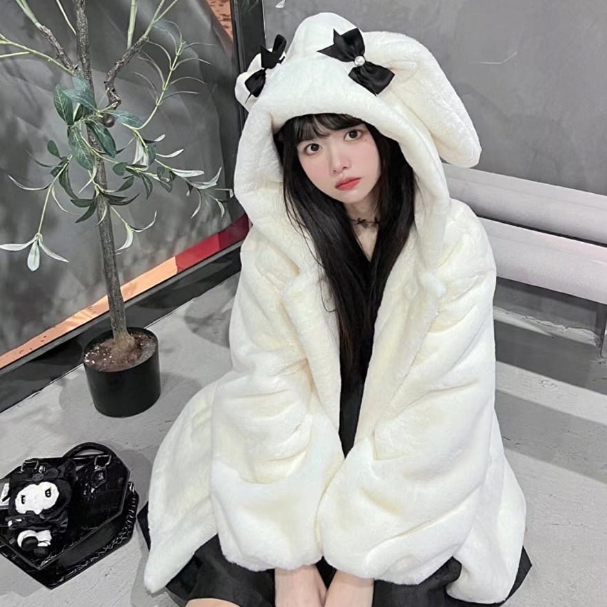 ビジュアル抜群なもふもふ白うさぎ耳がお茶目な厚手ジャケットです。