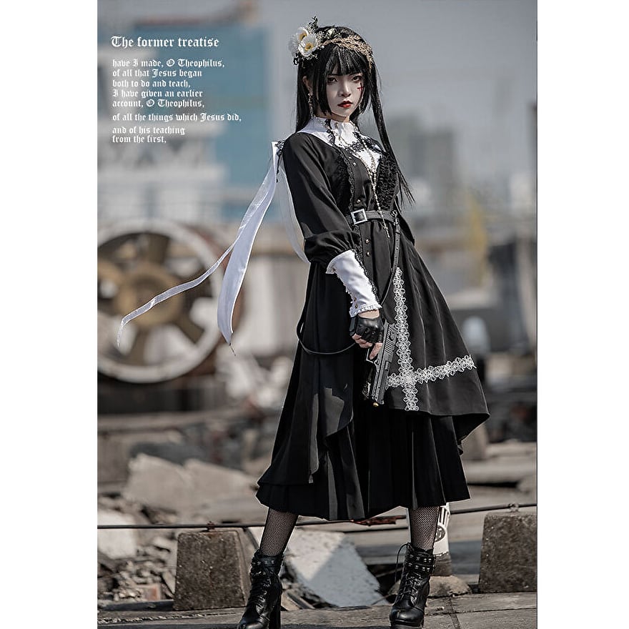 SEASONZ ロリータ服 ドレス ワンピ 軍服ロリータ ベルト付き 病み可愛い 地獄少女 ハイウエスト レイヤード ロング丈 ロマンティック