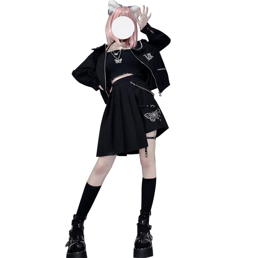 SEASONZ ロリータ セットアップ ショートジャケット プリーツミニスカ butterfly 刺繍 サブカルファッション Z世代 ストリート系 ロリータ地雷 ゆめかわ