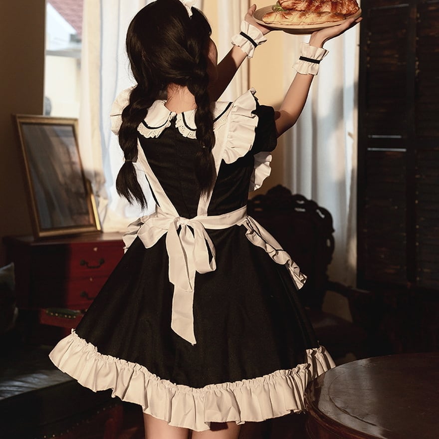 ワンピにエプロン、ヘアドレス、アームカバーの4点セットになります。