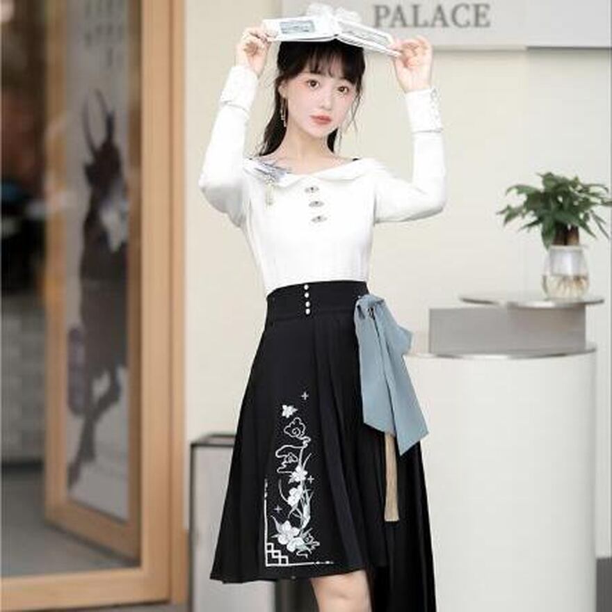 オフショルのニットに中華風刺繍がおしゃれなアシンメトリープリーツスカート