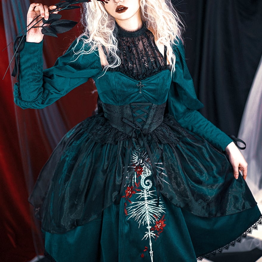 SEASONZ ロリータ ワンピ レイヤード スカート ゴシック Darkness 闇 病みかわ 刺繍 タツノオトシゴ COS コンカフェ イベント衣装 ゆめかわ
