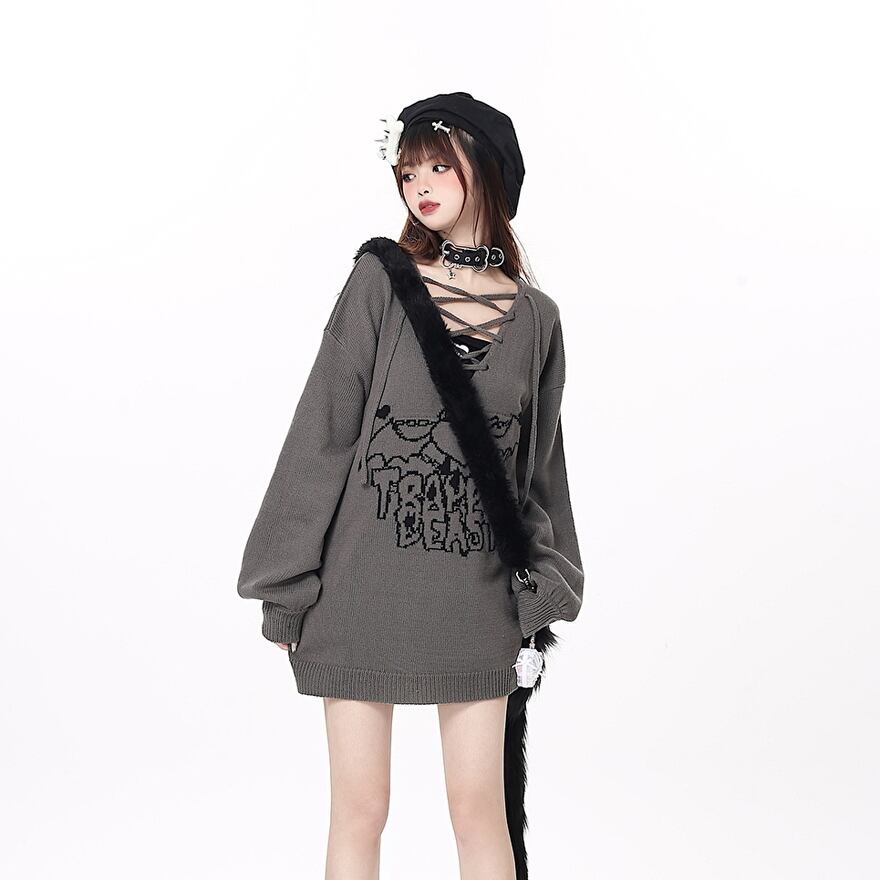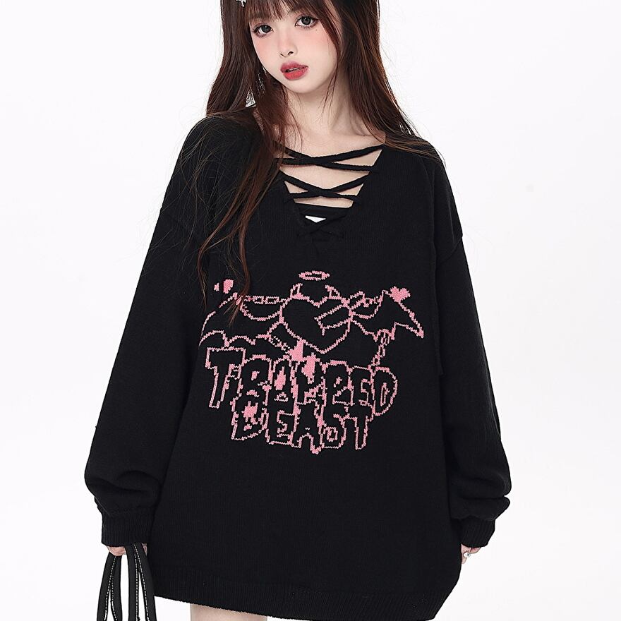 SEASONZ CRAZYGIRL セーター Vネック レースアップ オーバーサイズ ドロップショルダー サブカル女子 地雷服 ストリート系 JK かわいい ゆめかわ
