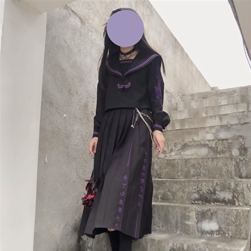 SEASONZ ロリータ女子 セーラー服 制服 プリーツ ロングスカート JK ハードガール ストリート系 病み可愛い 日本語 刺繍 不良少女 スパイシーガール コンカフェ ゆめかわ