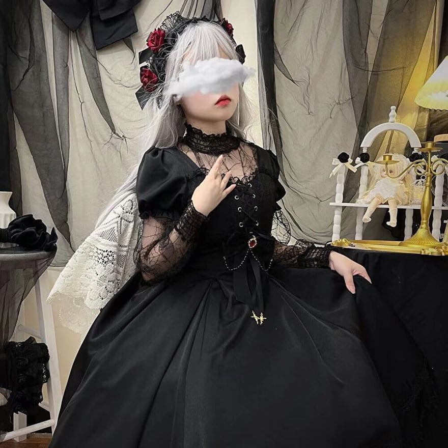 シアーな蜘蛛の巣のレースが病み可愛いゴスロリ半袖ワンピです