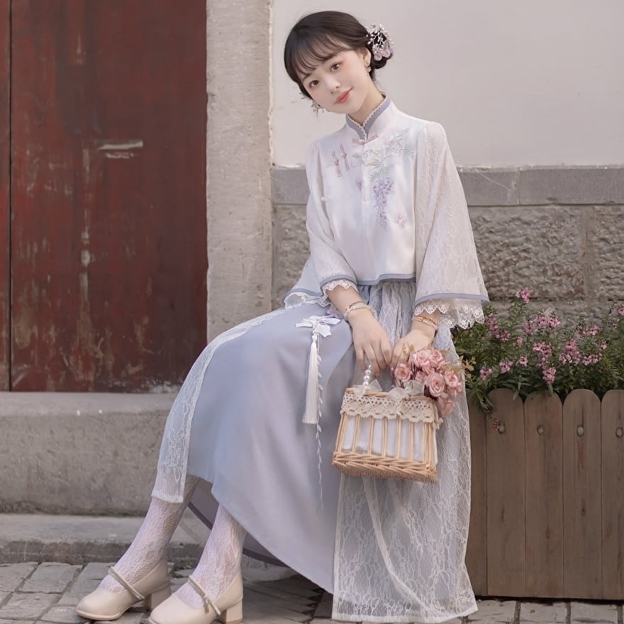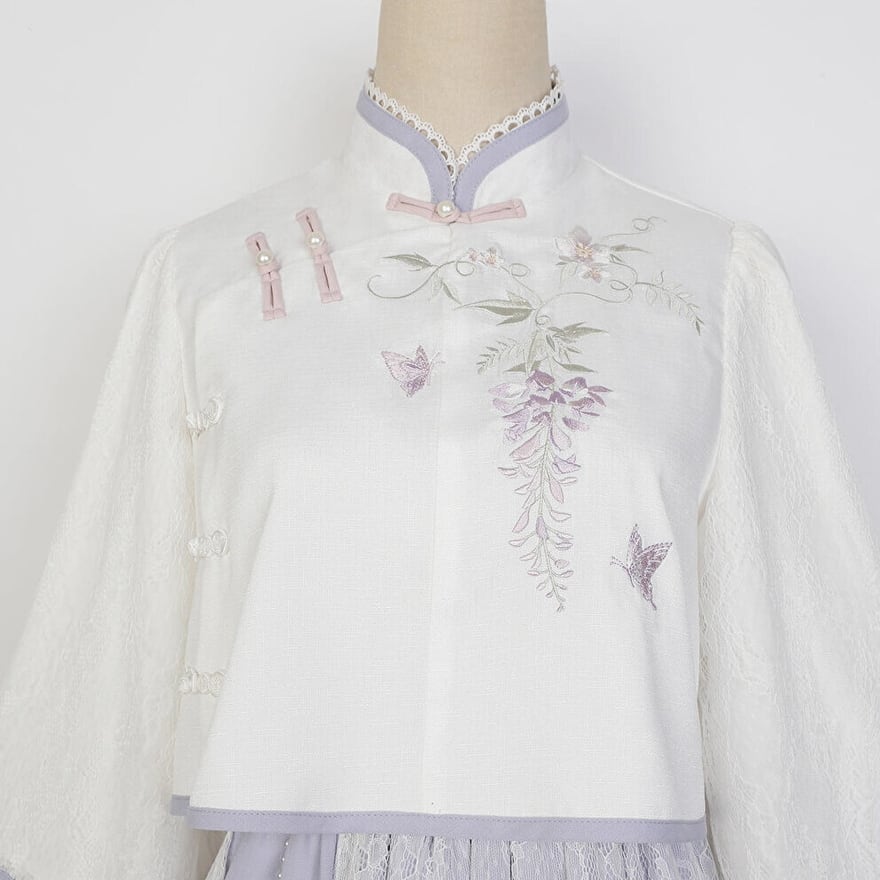 チャイナ服らしいスタンドカラーに藤の花の刺繍、スカートはタッセル付きのレースレイヤードがおしゃれ