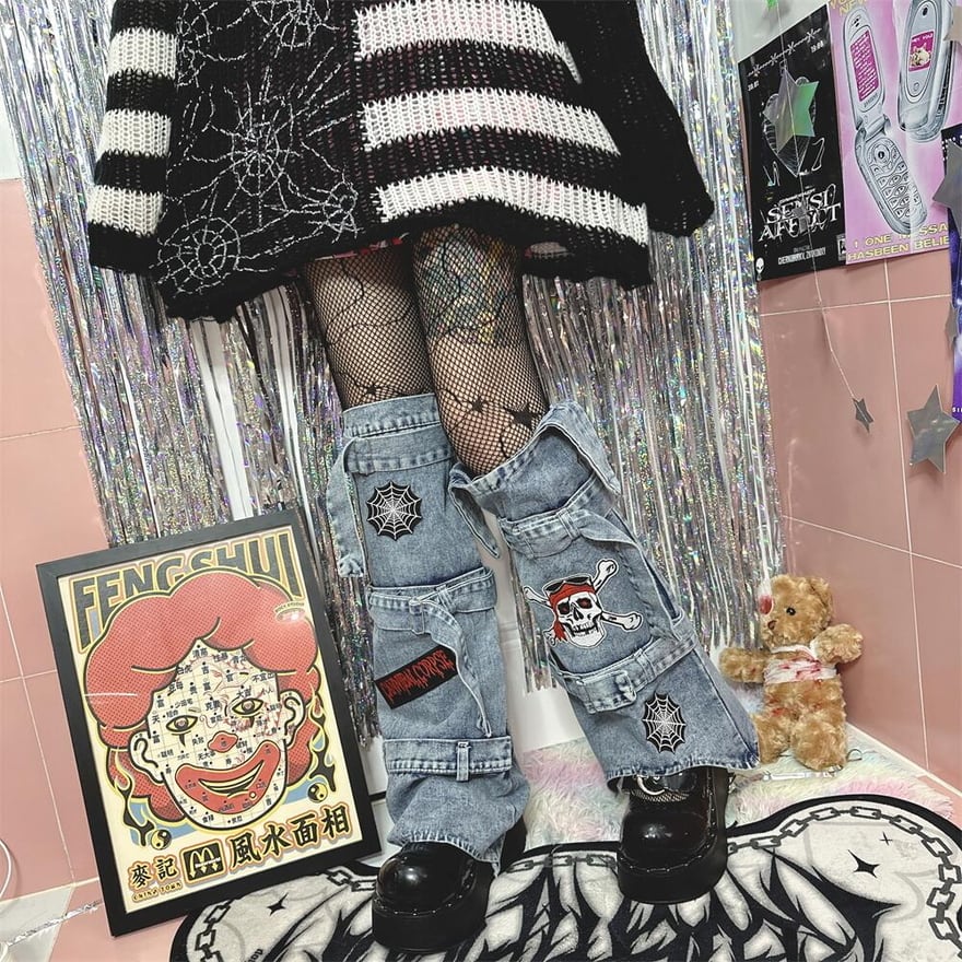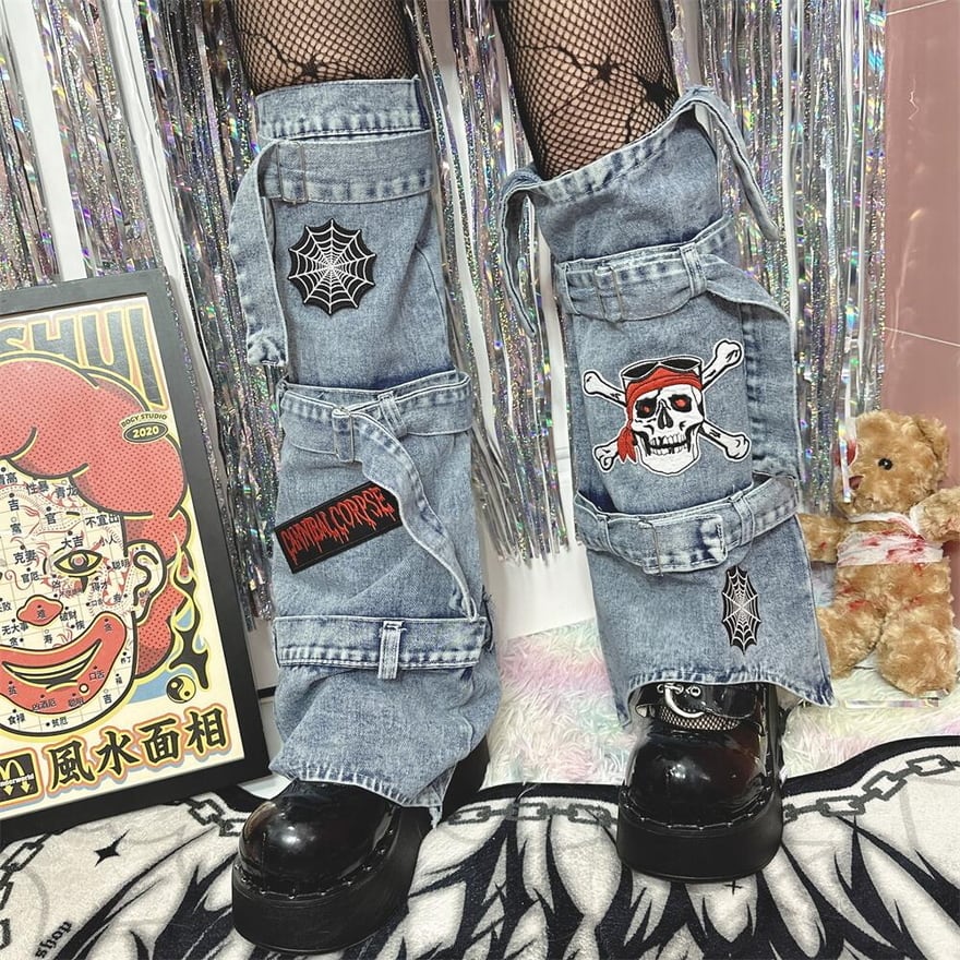 SEASONZ FANLOVE レッグカバー デニム ベルト巻き 伸縮ゴム スカル ハードゴシック 病み可愛い ストリート系 バンギャ Z世代 ゆめかわ