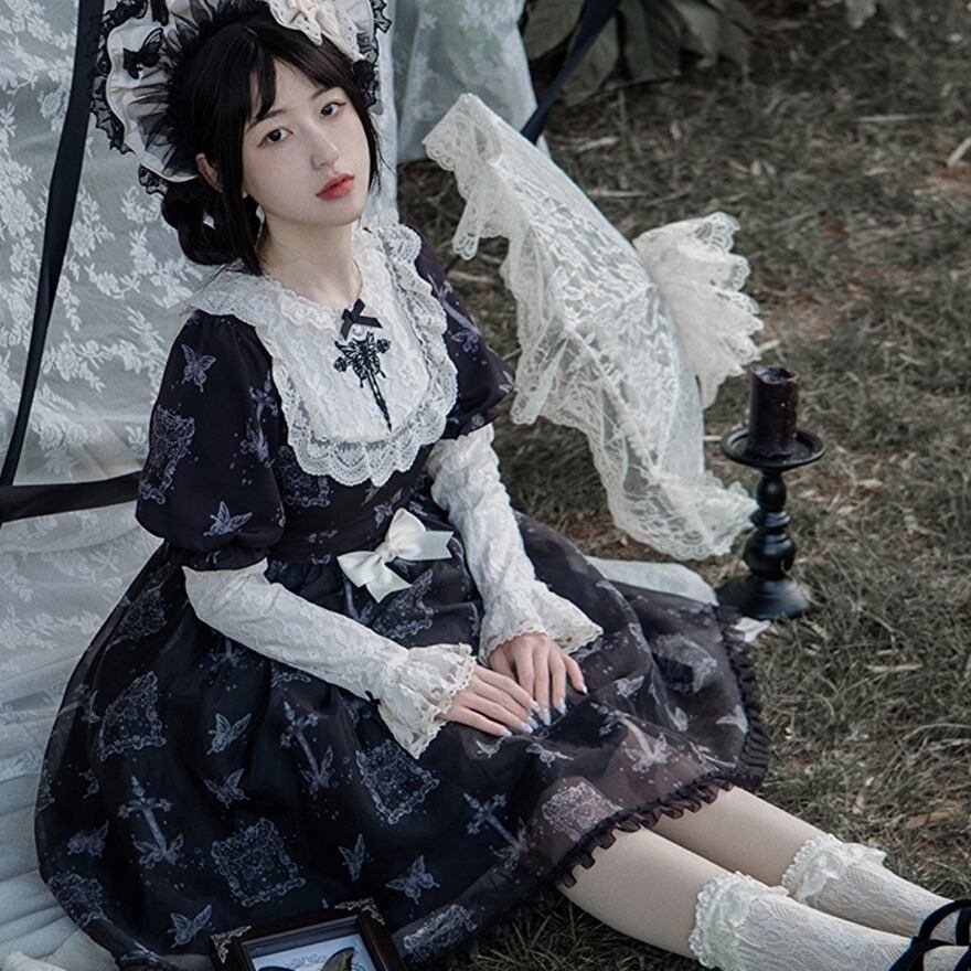 SEASONZ ワンピ 半袖 スリーブ リボン付属 butterfly 刺繍 病み可愛い ゴシック レース フリル ゆめかわ