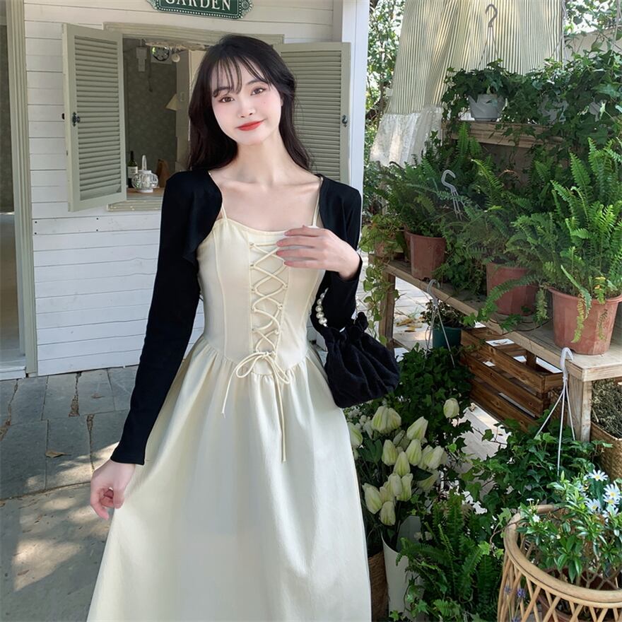 SEASONZ ツーピース カーディガン ワンピース ノースリーブ レースアップ ハイウエスト Aライン 大人増し きれいめ 高見え ゆめかわ