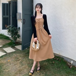 大人きれいめなレースアップワンピとカーディガンのツーピースです。