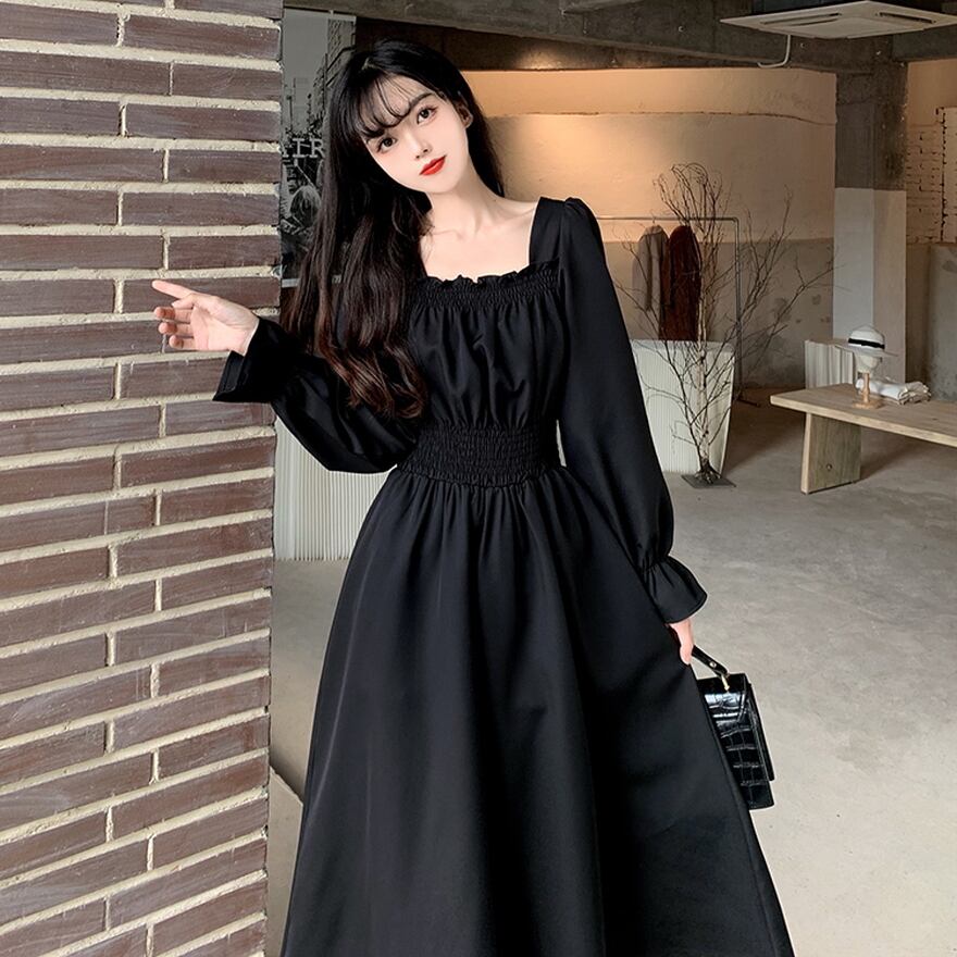 SEASONZ ワンピース ハイウエスト ロング丈 Aライン スクエア デコルテ パフスリーブ きれいめ 大人ゴシック 高見え 黒コーデ ゆめかわ