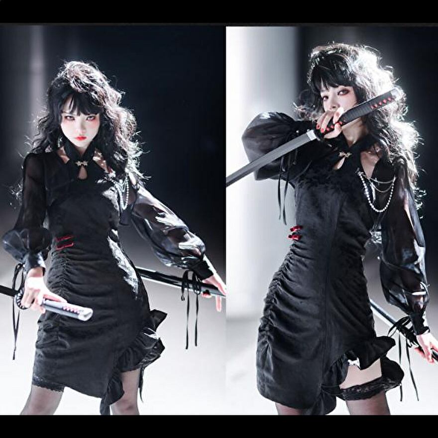 SEASONZ チャイナドレス 華ロリ ホルターネック フィッシュテールスカート ゴスロリ 病み可愛い 暗黒 チャイナ服 サブカル系地雷服 バンギャ コンカフェ イベント衣装 ゆめかわ