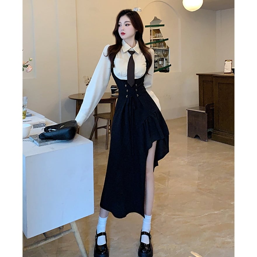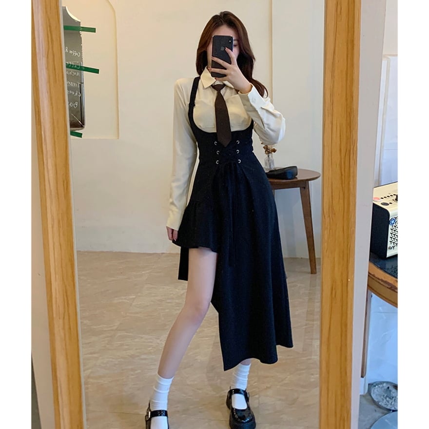 トップスはネクタイ付き、スカートはアシンメトリーがおしゃれ増し