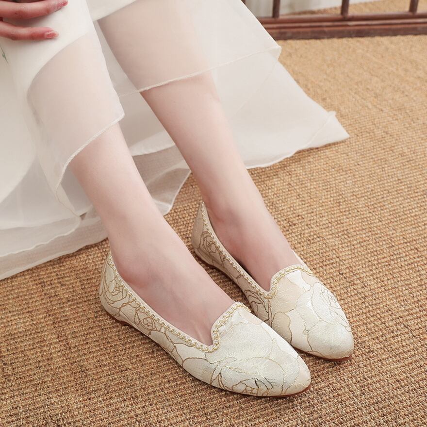 SEASONZ チャイナシューズ ポインテッドトゥ レトロ ローヒール 民族風 刺繍 繊細 花柄 華ロリ 軽量 ゆめかわ