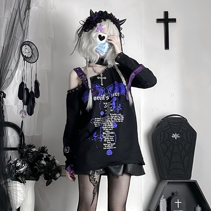 病み可愛いストラップベルトにloveリングがおしゃれ増しなワンショル長袖Tシャツです