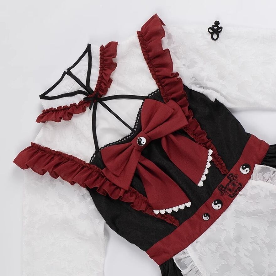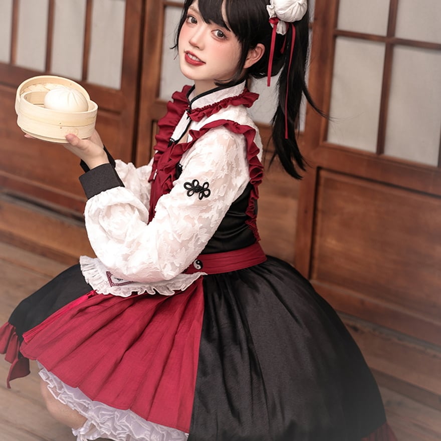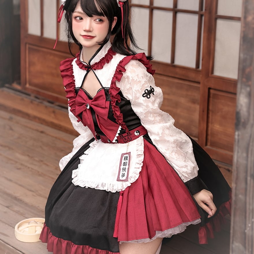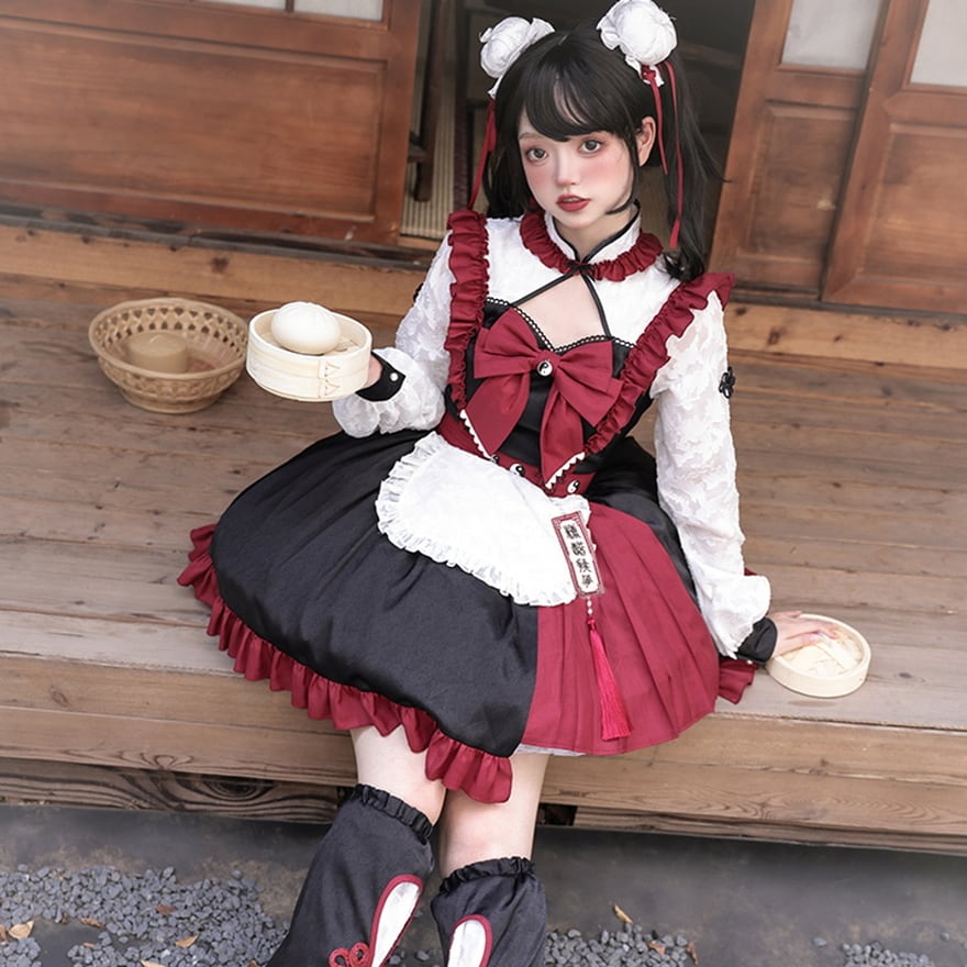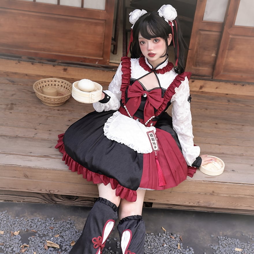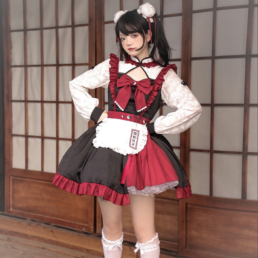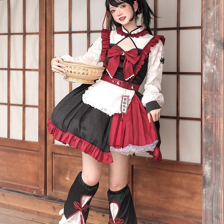 SEASONZ ロリータファッション通販 SEAONZ ハロウィン 学園祭 文化祭 お祭り チャイナ風 ワンピ フェイクツーピース リボン エプロン メイド服 ゆめかわ