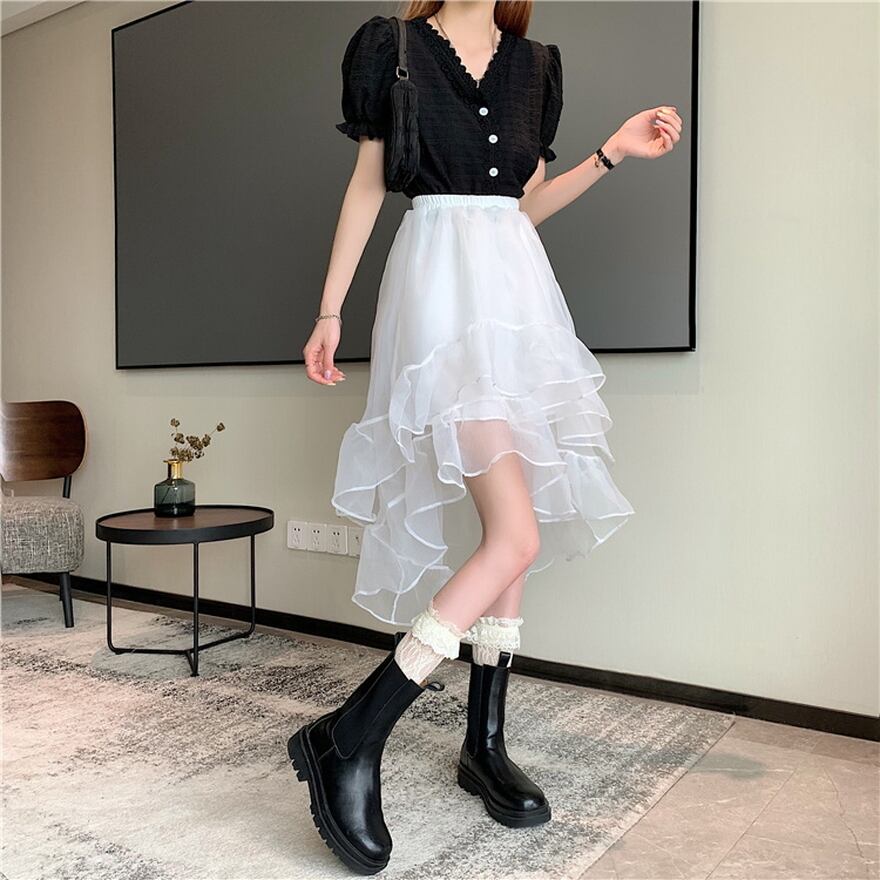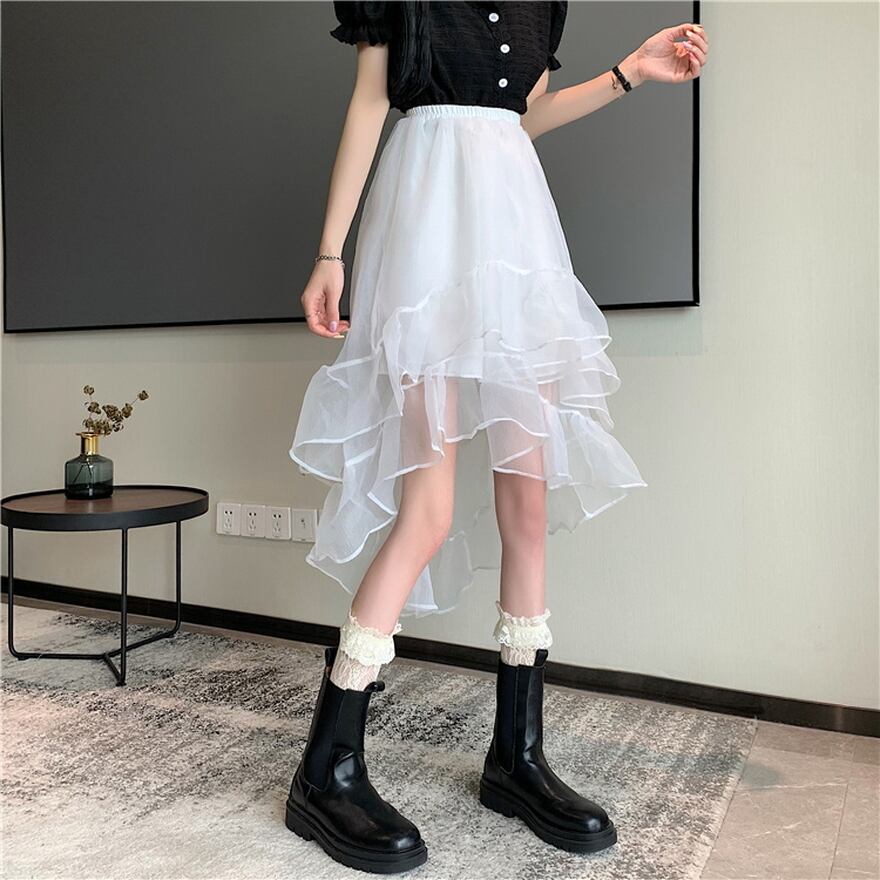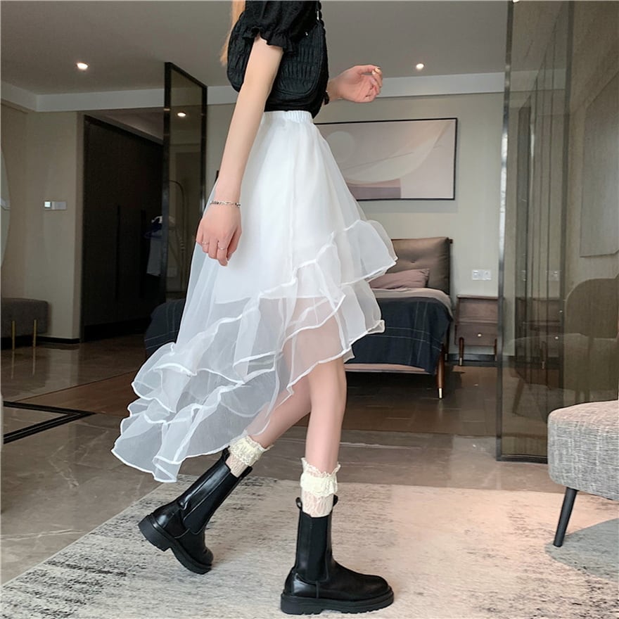 SEASONZ ロリータファッション通販 SEAONZ サブカル系 スカート アシンメトリー レース レイヤード ハイウエスト Aライン ストリート系 韓国 オルチャン ゆめかわ