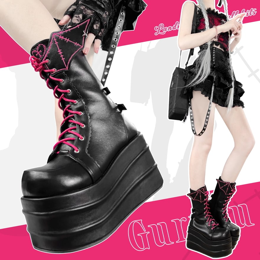 SEASONZ ソフトロリータ 厚底靴 GURURU オリジナル ストリート系 パンク PUレザー コウモリ ヒール高10cm 病み可愛い 地雷服