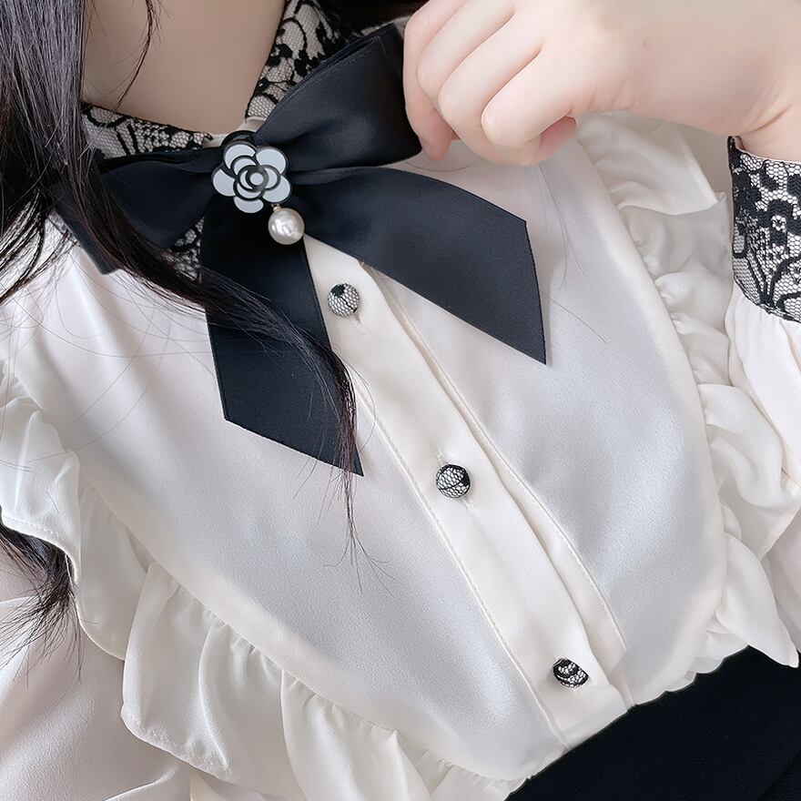 さらには、胸元にはカメリアとリボンがあしらわれ、エレガントな雰囲気がプラスされたブラウスです。