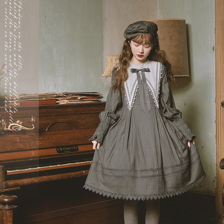 ダークトーンのピンストライプ柄がクラシカルな、ロリータファッションにぴったりなクラロリワンピース。