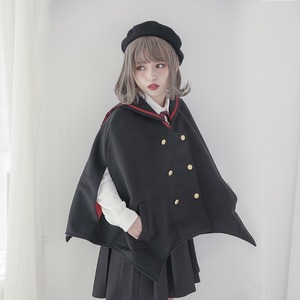 マントの長さも、ヒップまであるので大人っぽい印象に。また、裾には飾り紐がついており、風になびく度にツヤツヤした紐の揺れが可愛らしいアクセントになっています。