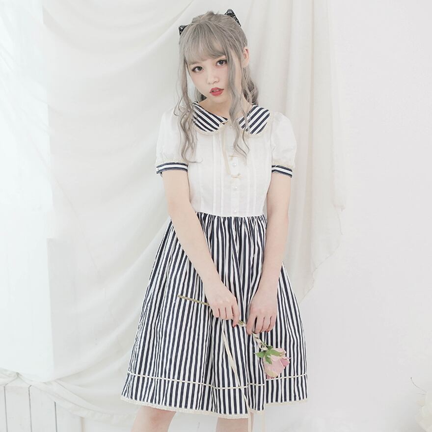 SEASONZ ロリータブランド DollyDelly 半袖 ワンピース JKファッション ストライプ柄 レトロ ソフトロリータ 控えめ 普段着使い ゆめかわ