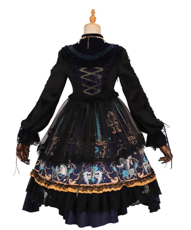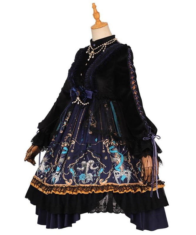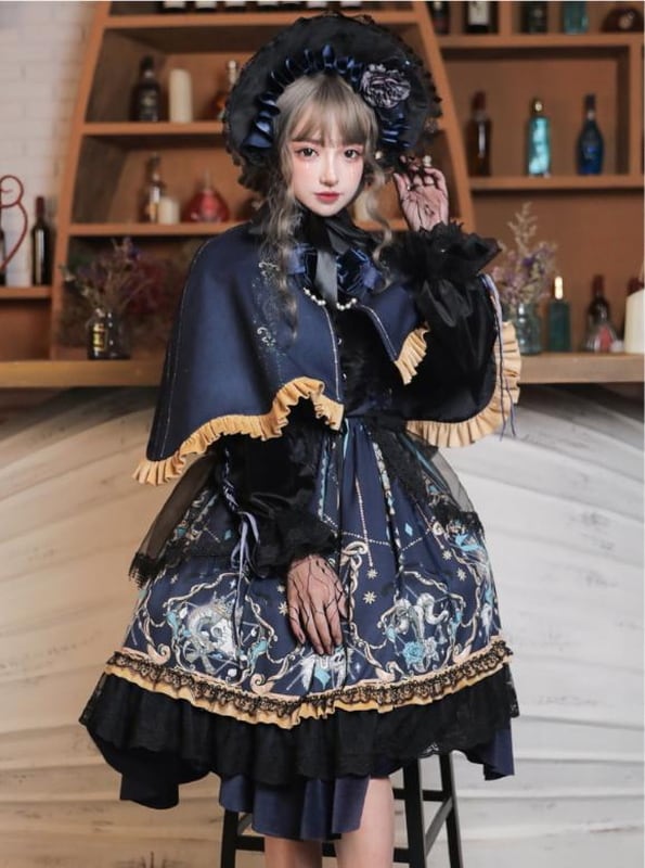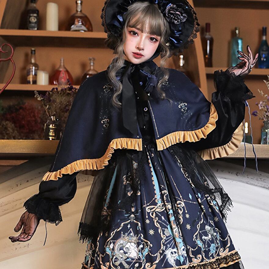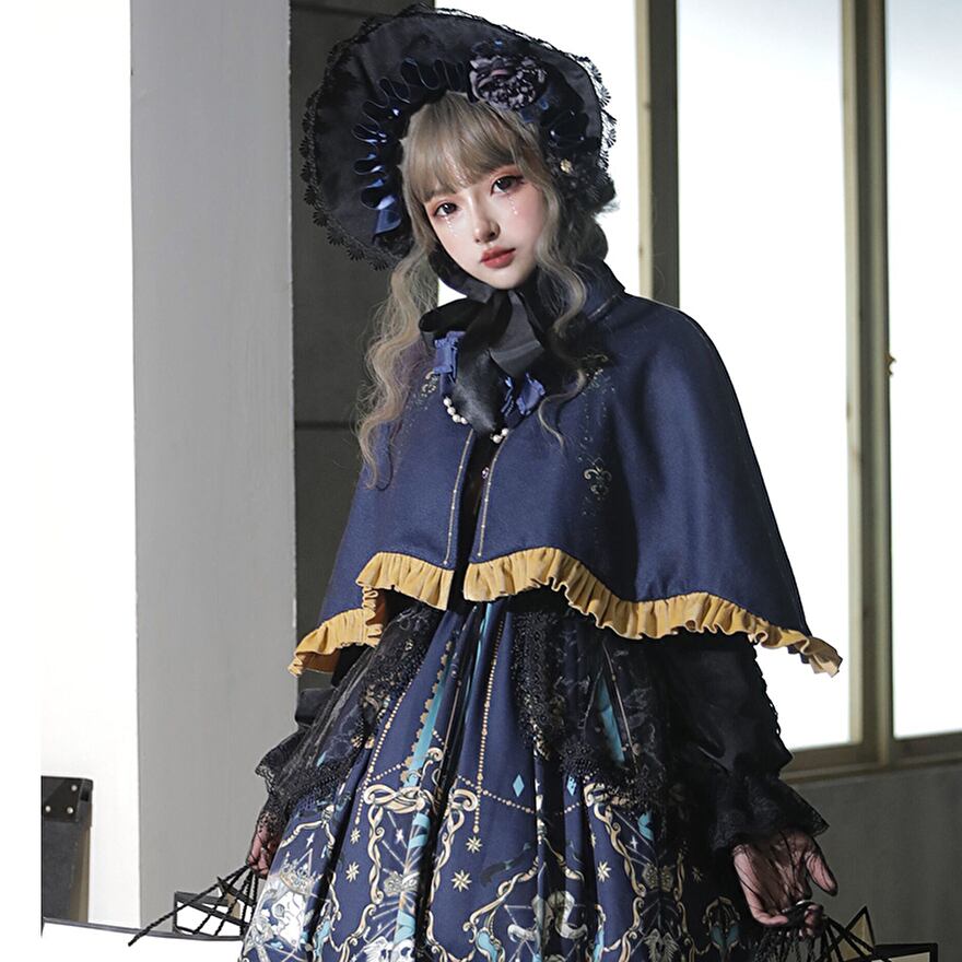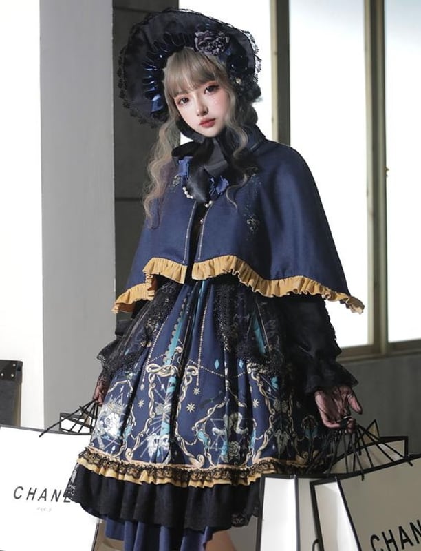夢可愛い本格的な甘ロリワンピです。甘めの星座プリント柄にブラックレースのレイヤースカート、フリルで縁取られたショールケープが病み可愛さをプラス。