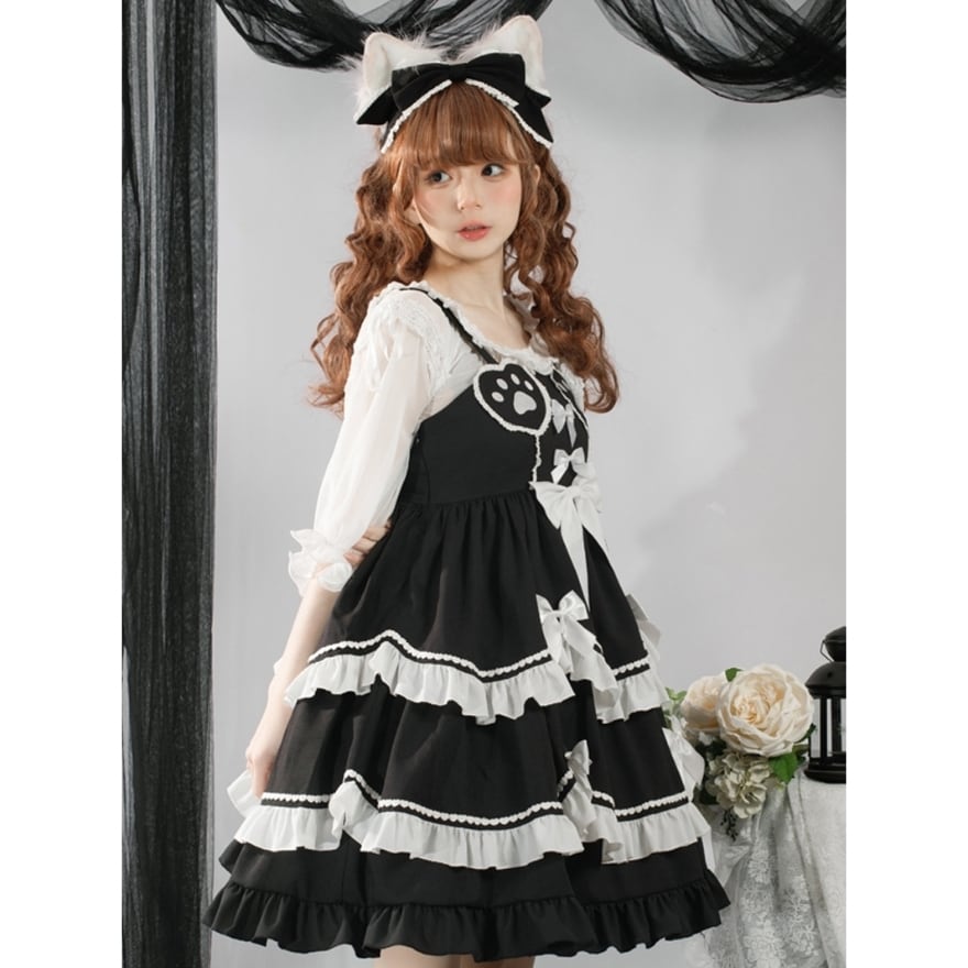 ロリータブランドEieyomiからお届けするスイートロリータのJSK ジャンパースカートです。レトロなリボンやフリルがあしらわれ、ガーリーな雰囲気が漂うデザインです。
