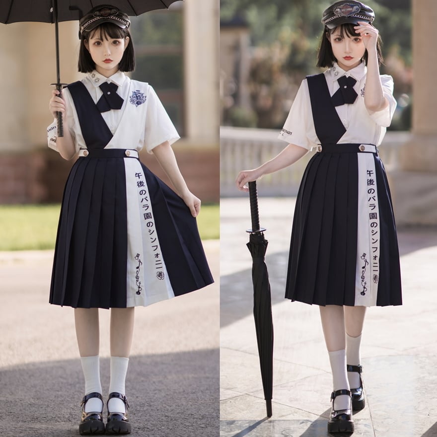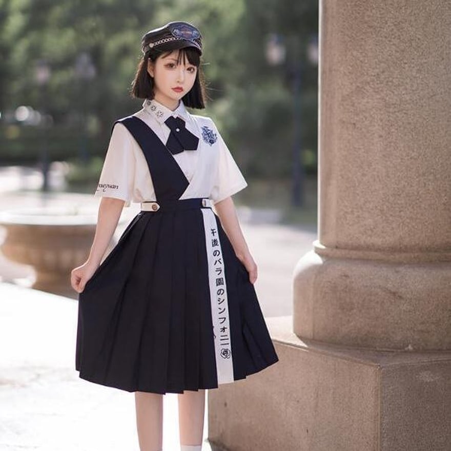 半袖のシャツとジャンパースカートの上下セットで学園系ファッションにぴったり。スカートのフレア感とセーラーカラーが、かわいらしさを際立たせます。