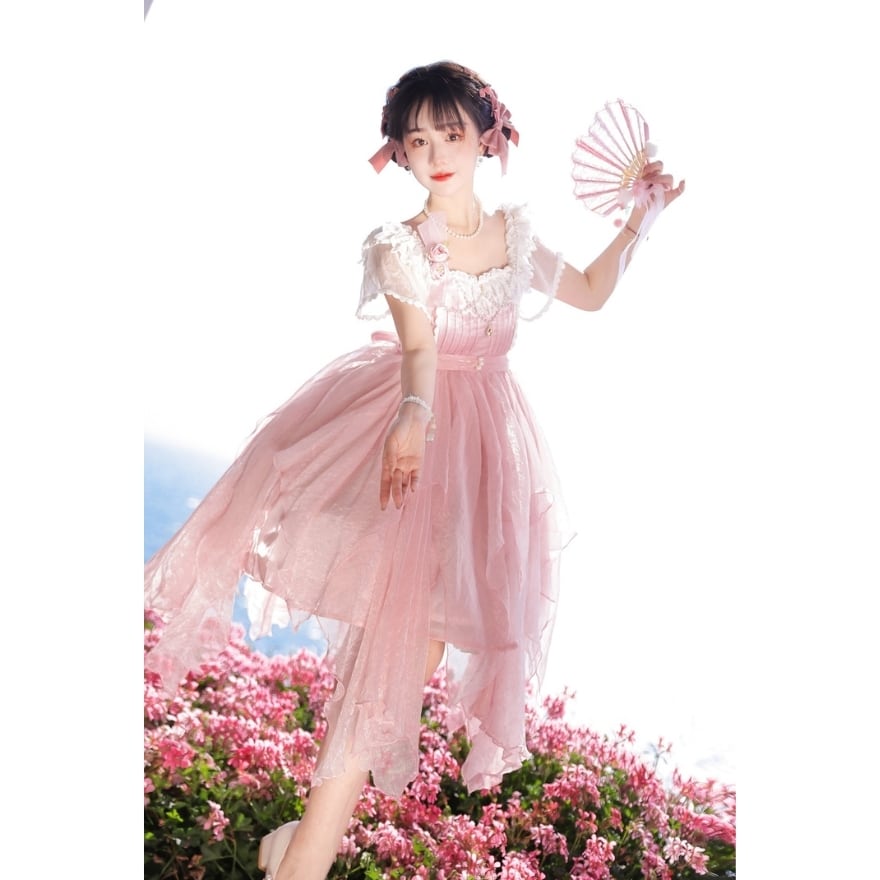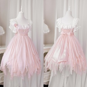 アシンメトリーデザインで更に個性を際立たせた一枚で、贅沢に散りばめられたレースやフリルが、可愛らしい甘さを演出しています。
