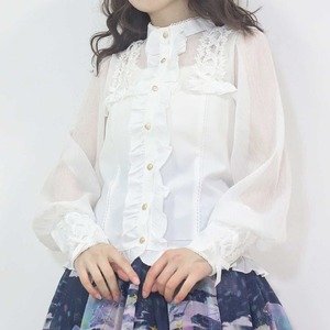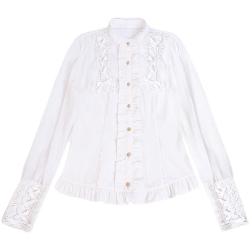 長袖で女性らしいシルエットに、フロント部分のレースアップやフリルがかわいらしいデザインのブラウスです