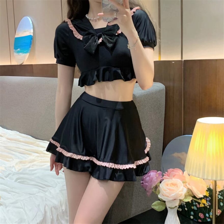 使い回し易いブラックにフリル、リボンがガーリーなセパレートタイプの水着です