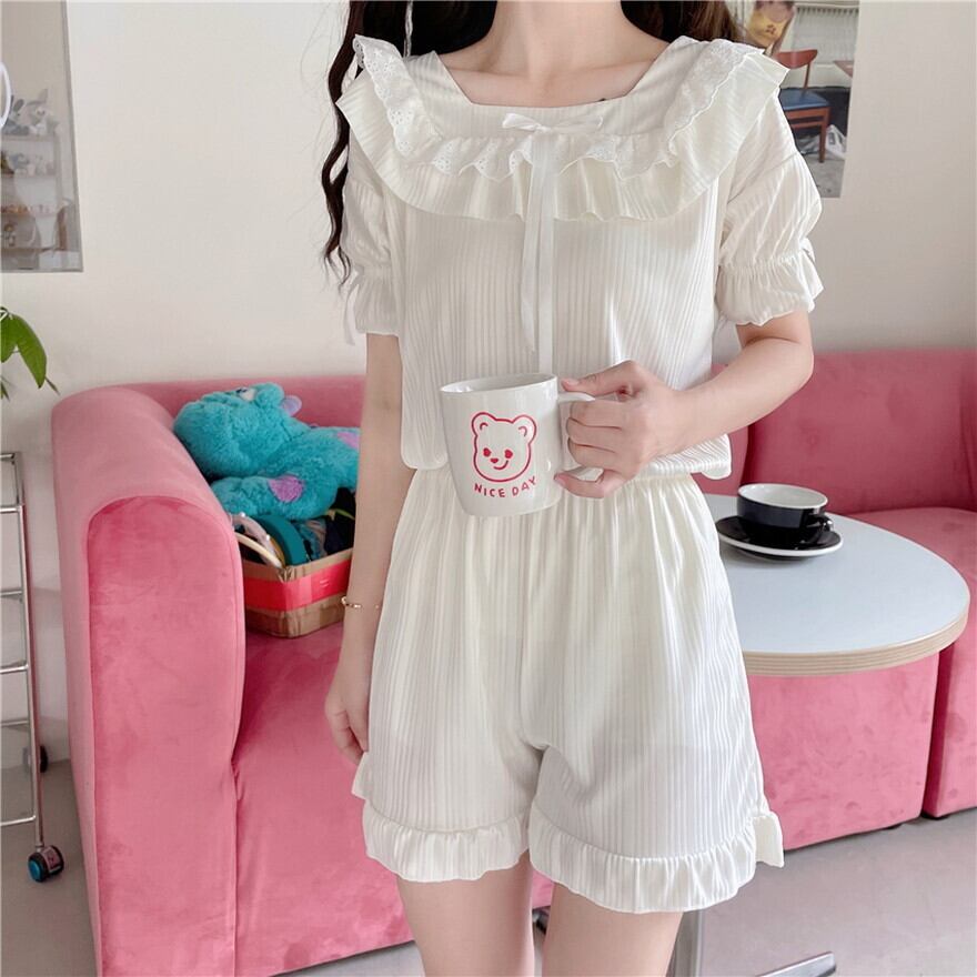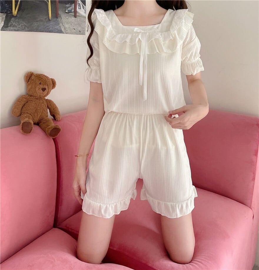 フェミニンで可愛らしいデザインのパジャマです。胸元のワンポイントレースがロマンティックな装いを演出してくれます。ルームウェアとしてお泊りや旅行にも