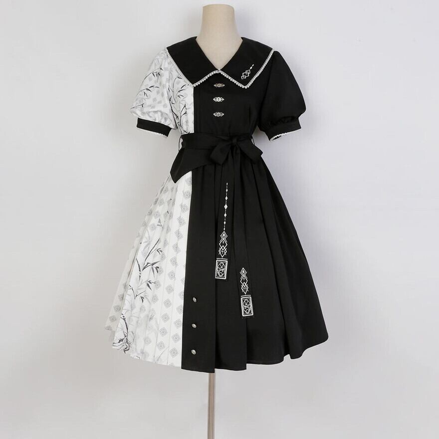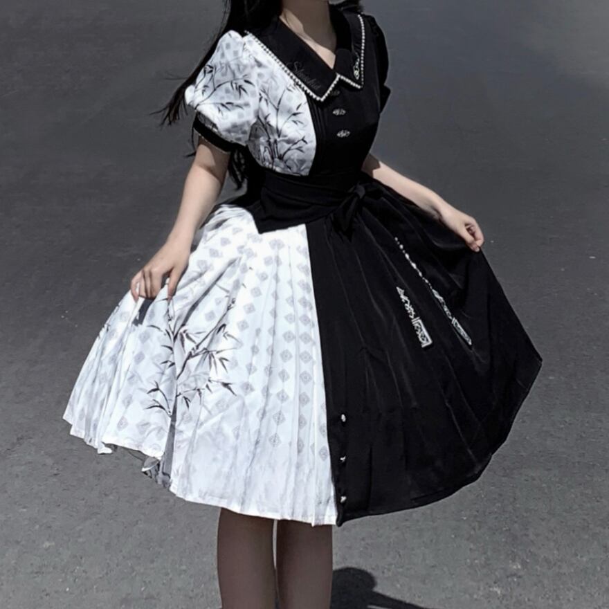 レトロな竹柄にバイカラーのモダンデザインの華ロリワンピです。