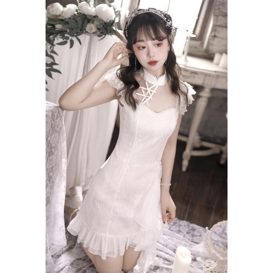 SEASONZ 華ロリ 中華ロリータ チャイナ風 チャイナドレス ホワイトロリータ 半袖 立ち襟 レース ガーリー 甘め