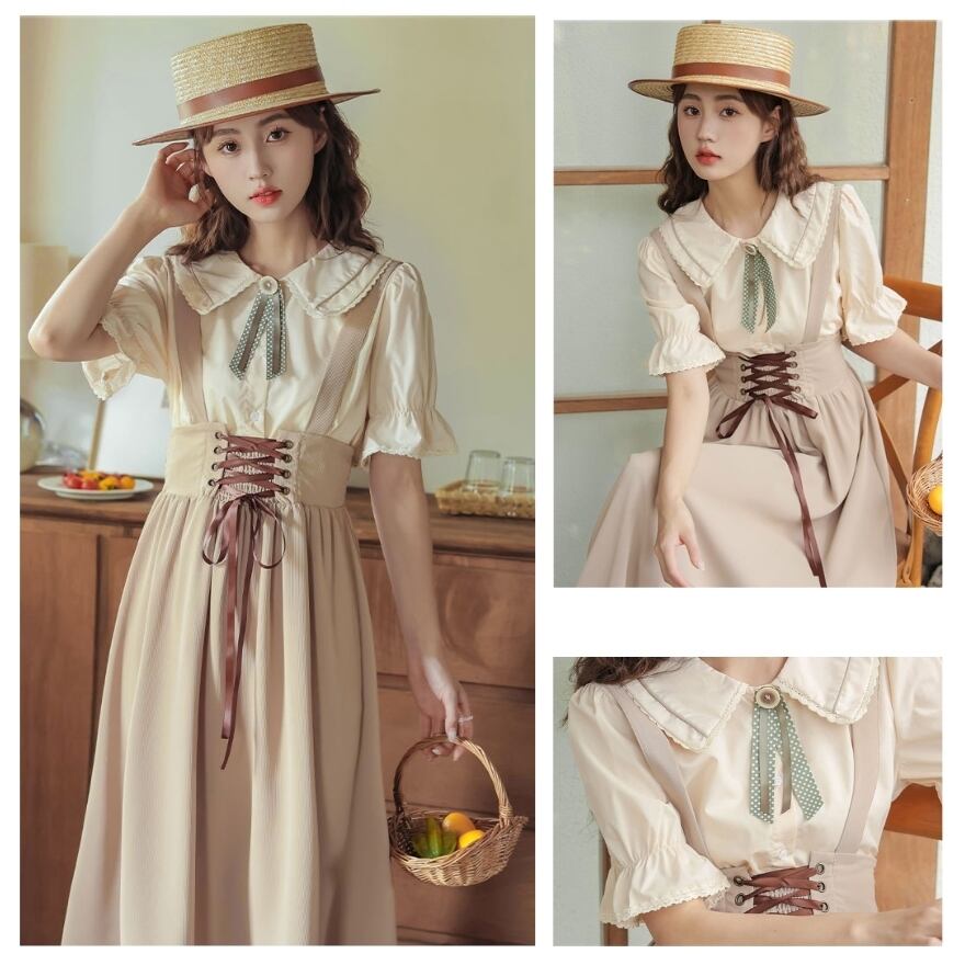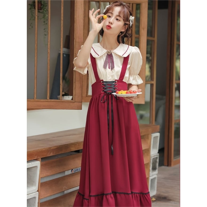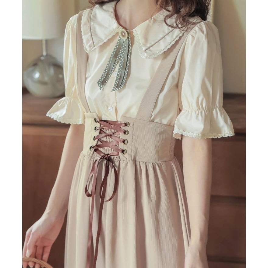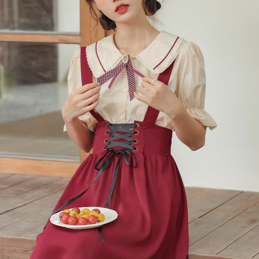 ハイウエストなレースアップのスカートにネックリボンがかわいい普段着使いのセットアップです。