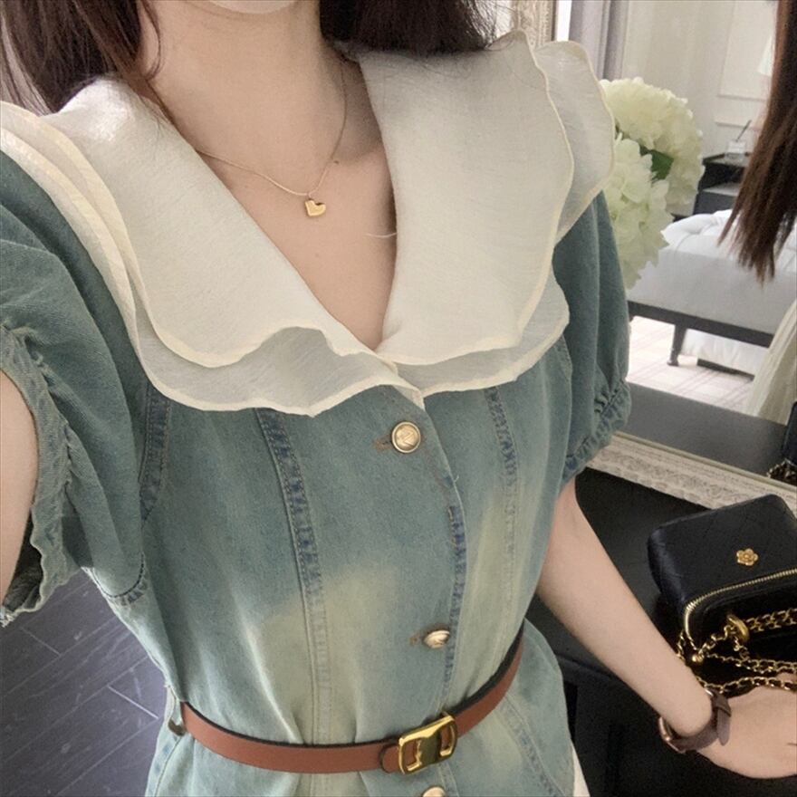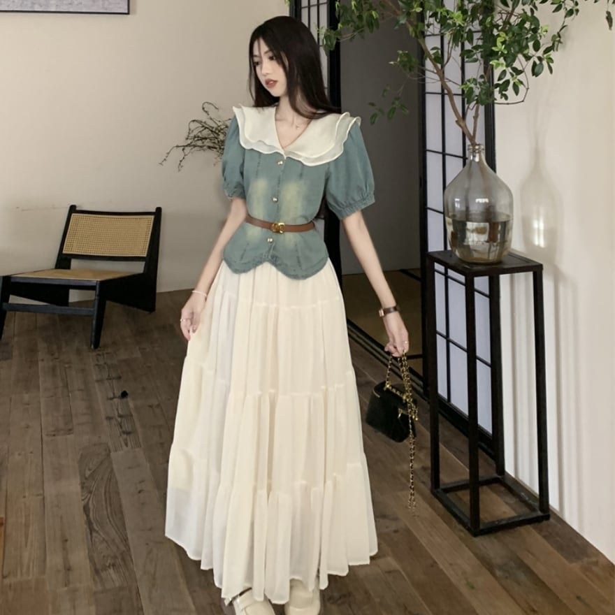 SEASONZ セットアップ デニムシャツ スカート ハイウエスト ガーリー 甘め 普段着 控えめ ろりーた 服