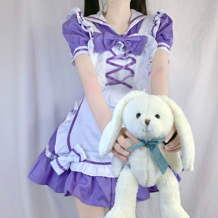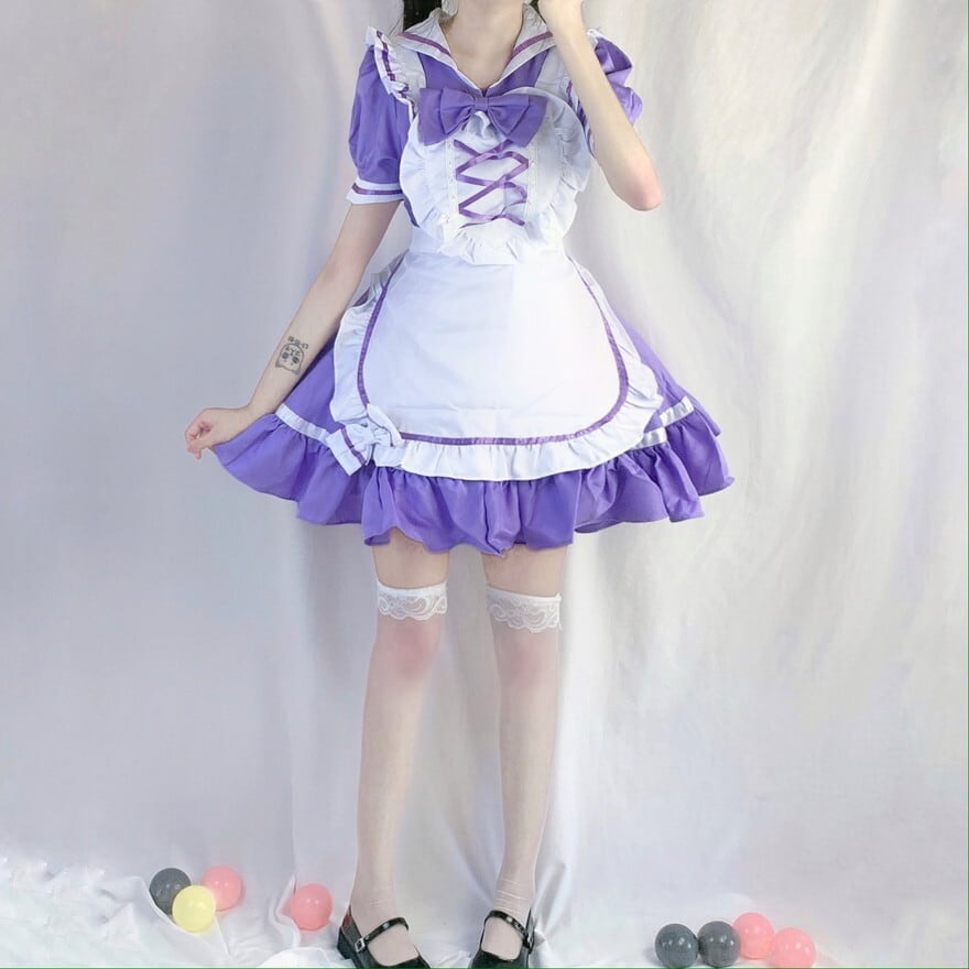 メイド服 コスプレ ワンピ エプロン カチューシャ パープル ガーリー メイドカフェ コンカフェ ろりーた 服