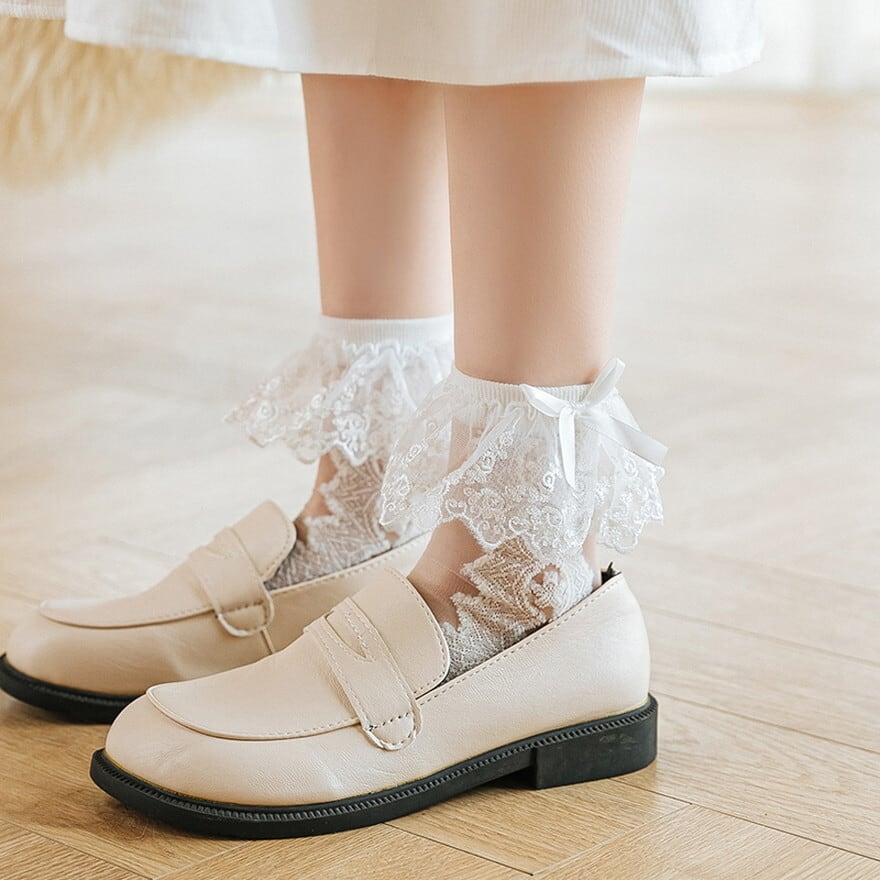 リボンに繊細なレースがおしゃれ見えする上品なすずらんソックスです。