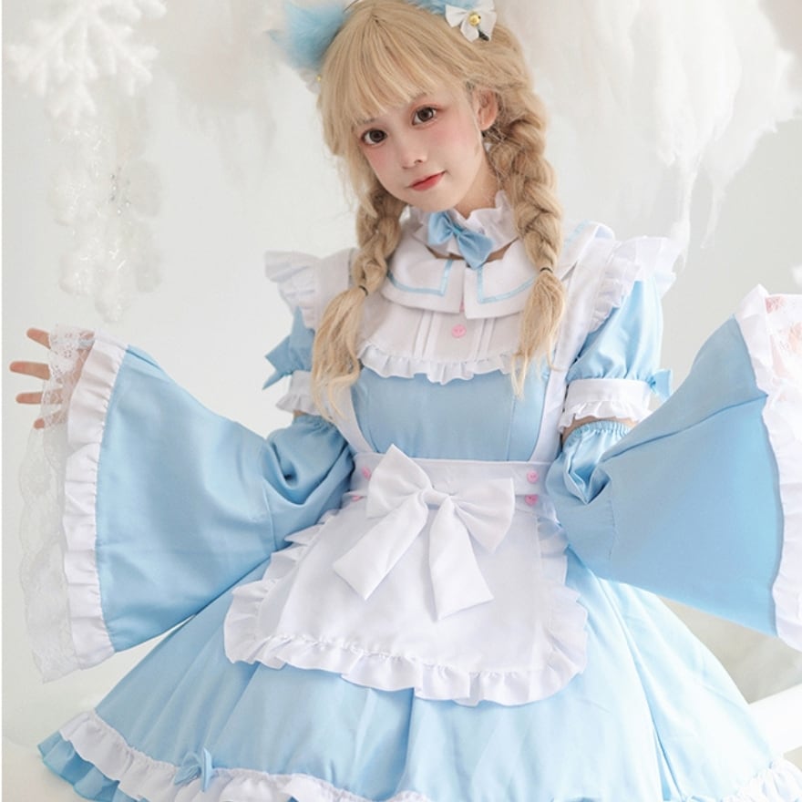 SEASONZ メイド服 ワンピ ワイドスリーブ フリル リボン コスプレ 舞台衣装 イベント 甘め