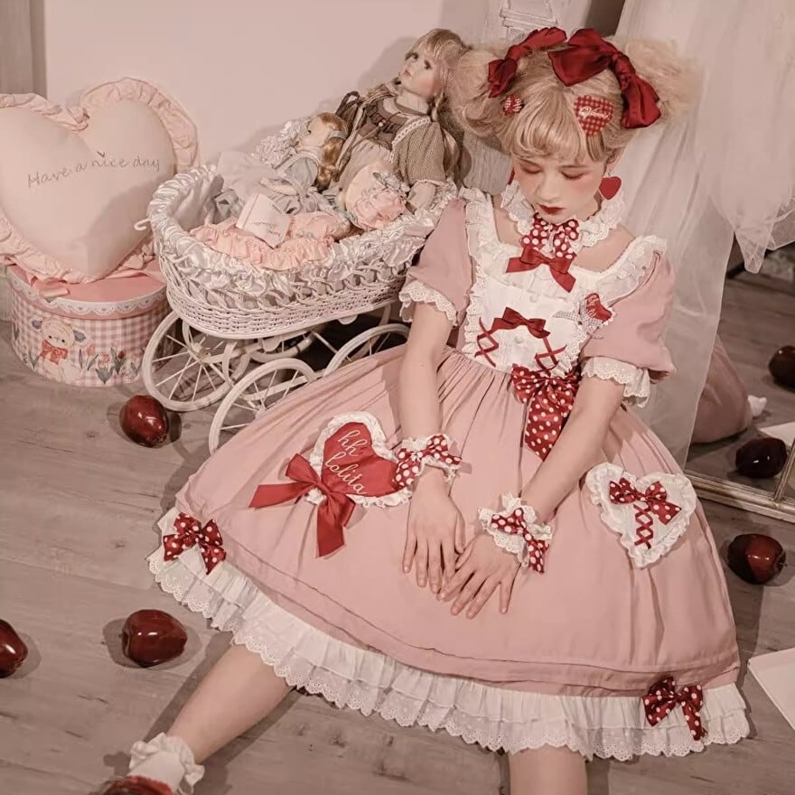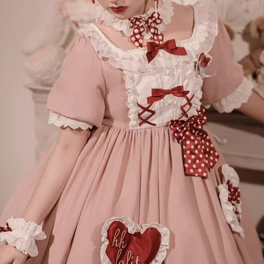 SEASONZ スイートロリータ ワンピース Love フリル レース編上げ ネックリボン ガーリー 甘め lolita 甘め ろりーた 服