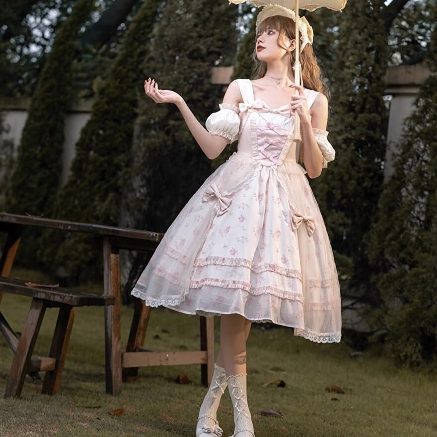 フェミニンで可愛らしい花柄デザインのJSK ジャンパースカートです。リボンやフリル、レースが豊富に使われ、プリンセスラインのシルエットが美しく、クラシカルでロマンティックな装いを演出してくれます。