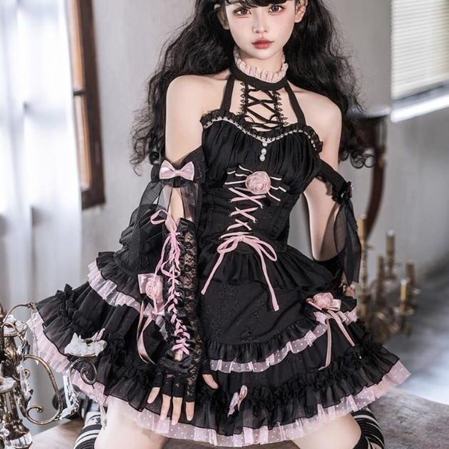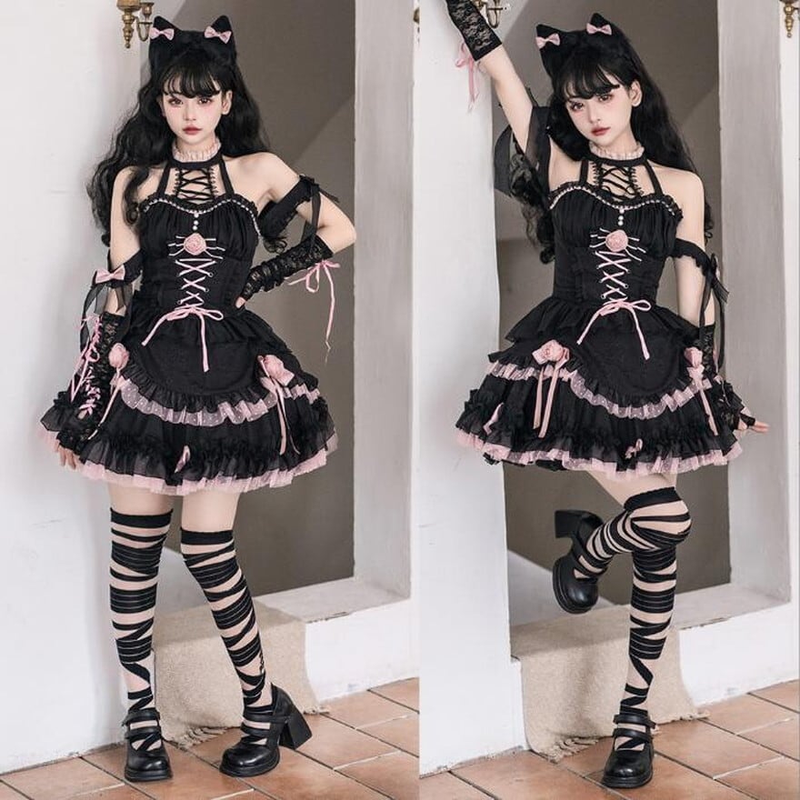 ビジュアルインパクト抜群なブラックとピンクのJSK ジャンパースカートに黒猫カチューシャと編み上げスリーブ、ストラップのフルセットです。