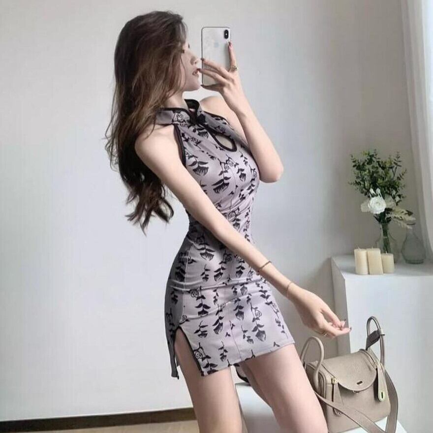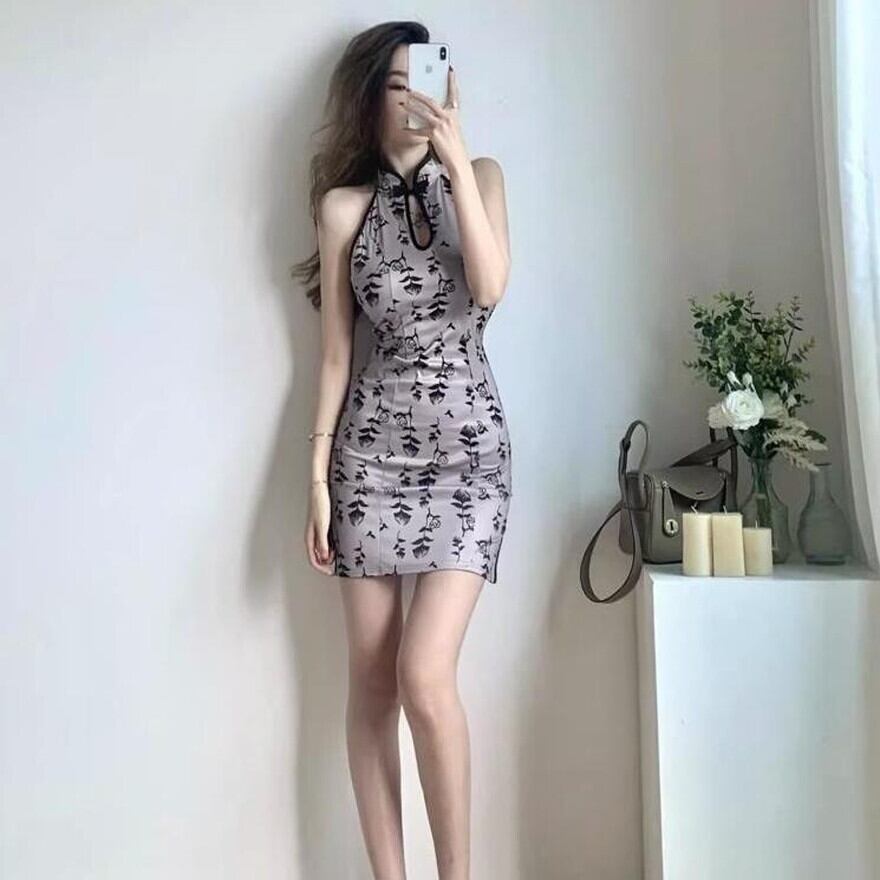 ヘルシーなミニ丈の花柄チャイナドレスです。