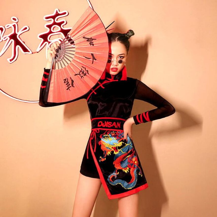 イベント、コスプレにも人気のチャイナ風ドラゴン柄のダンス衣装です。